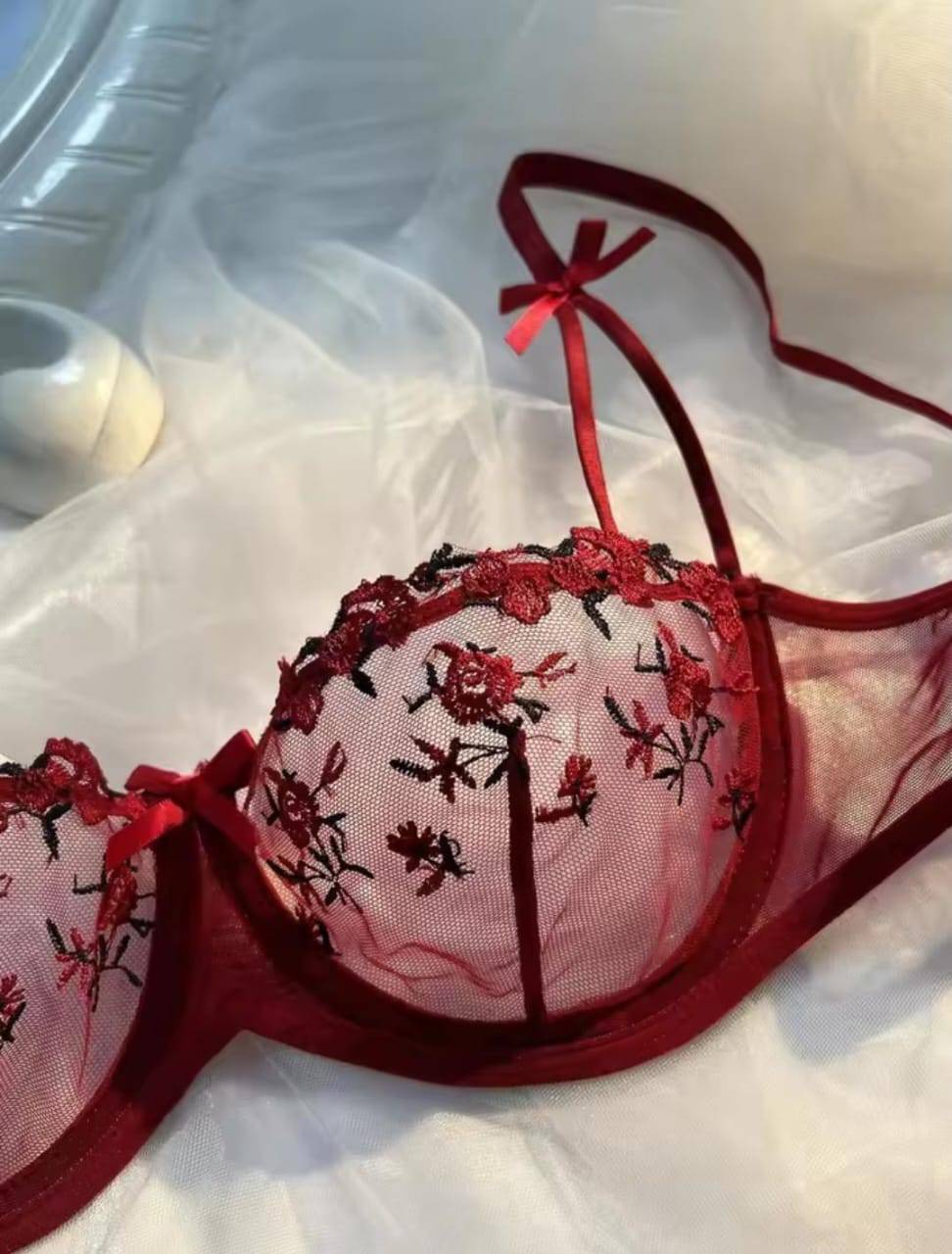 sexy red lingerie set with floral print, bow detail, random pattern.